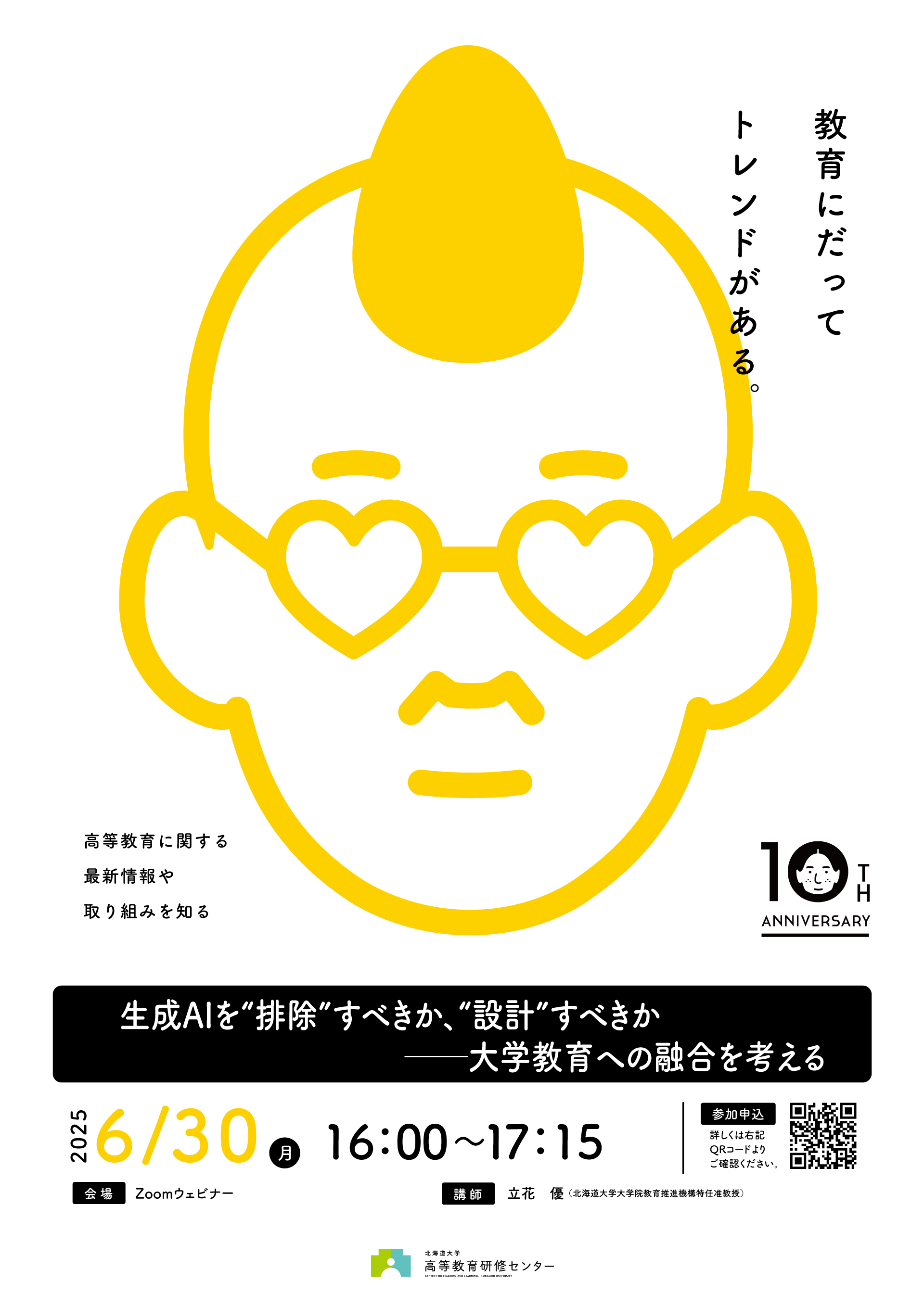 パッケージ研修の導入セッションとなる本講演では、最新の生成AI技術・サービスの教育的可能性と限界を示した上で、「排除か、設計か」という問いを切り口に、教育者に求められる視点の転換――すなわち、段階別活用、目的別設計、学生のAIリテラシー育成といった具体的な教育再設計の方向性を提示します。